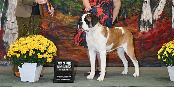 Otter is still a puppy and just starting her show career. As a quality bred Saint Bernard, Otter was the 2025 Saint Bernard Club of America Best Puppy. With her lively personality and beautiful breed type, she has already earned several titles and won multiple group placements showcasing the excellence of her pedigree!